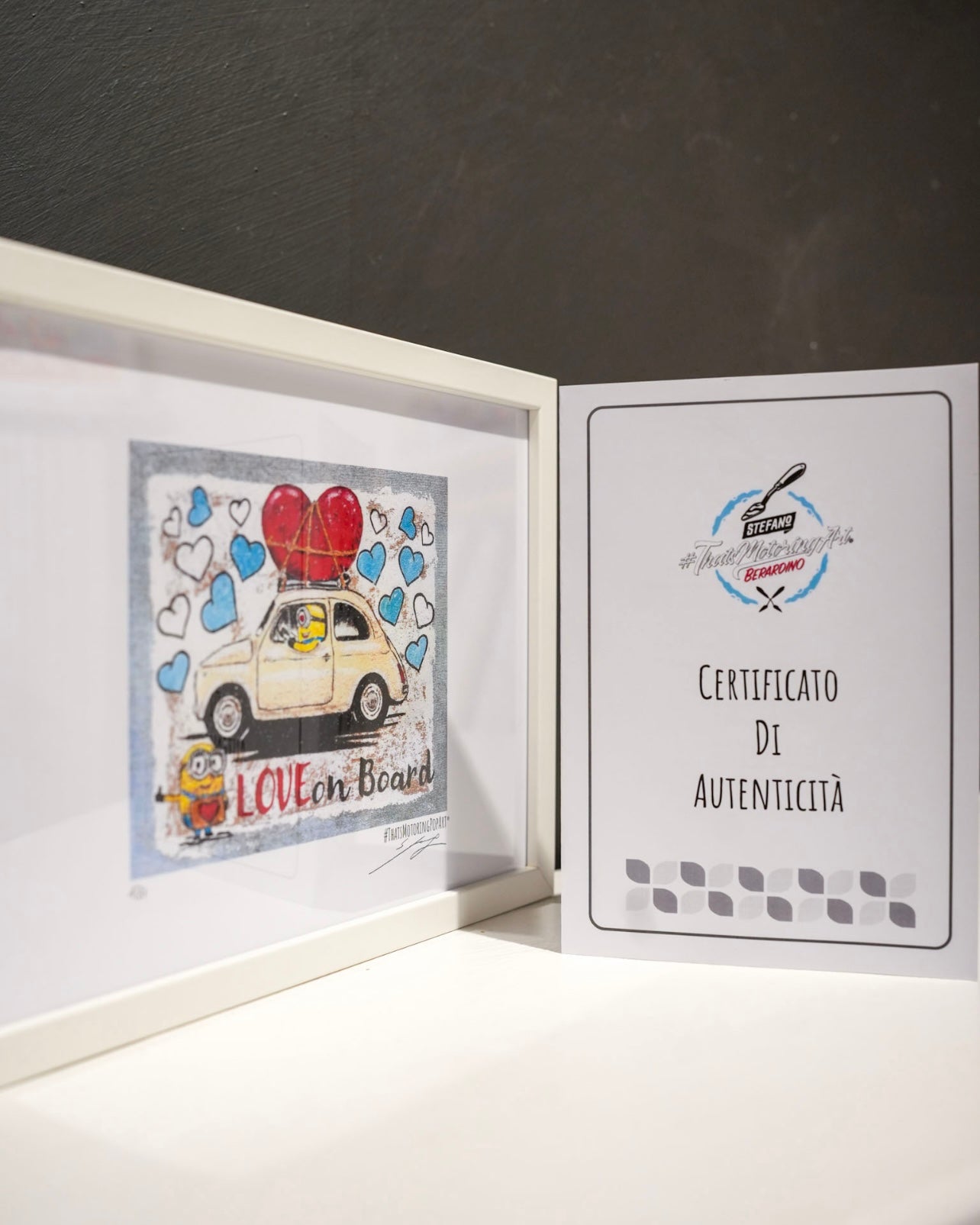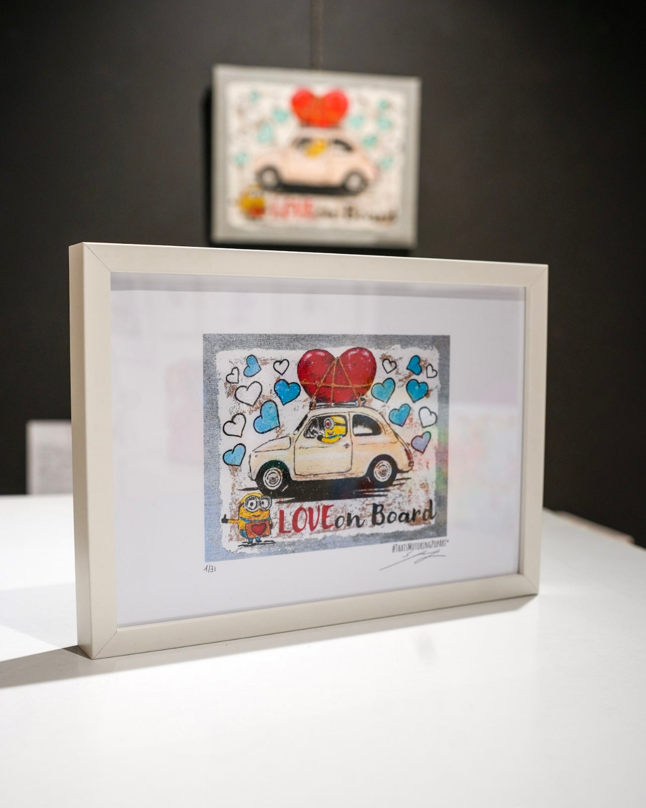 All’interno dell’abitacolo, un Minion dall’espressione curiosa e partecipe guida il viaggio, mentre la compagna, a terra, con un cuore stretto tra le mani, accompagna la partenza con entusiasmo e complicità. Questi dettagli narrativi, tipici del linguaggio di Berardino, rendono l’opera una piccola storia d’amore illustrata, immediata e universale, capace di parlare a chiunque abbia amato almeno una volta.